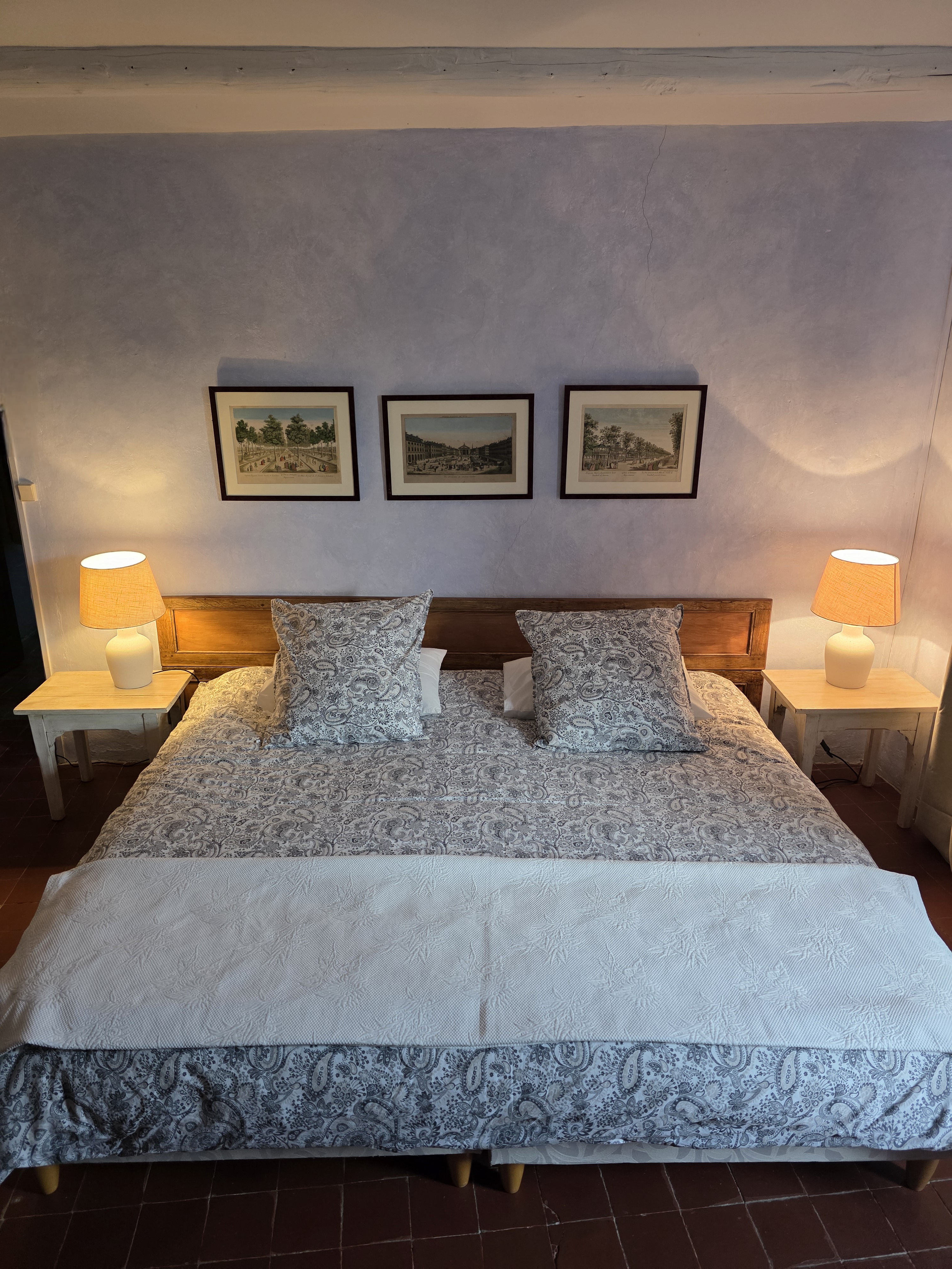 A Provençal-style room featuring a queen size bed and a private shower room, bidet and WC. The room has a private entrance on a classic balcony, accessible via an antique stone staircase covered in fragrant jasmine It also offers views of our interior courtyard where you can sit and relax in the shade of the linden trees and be surrounded by classic limestone farm walls that enclose the peaceful courtyard.