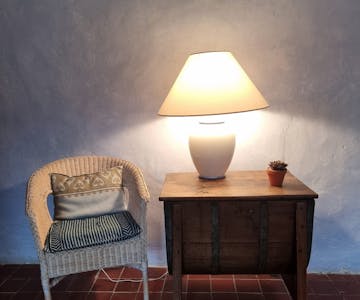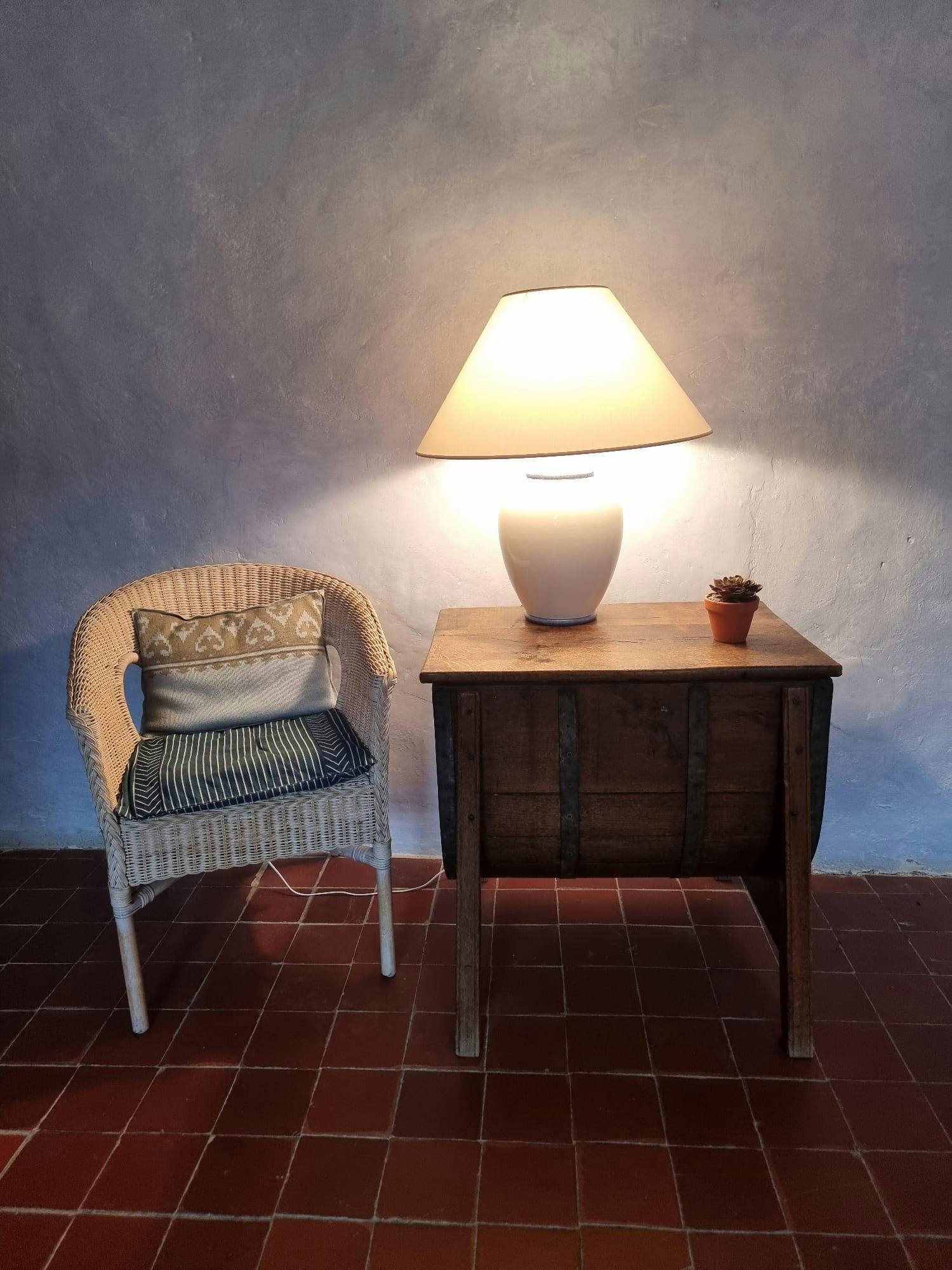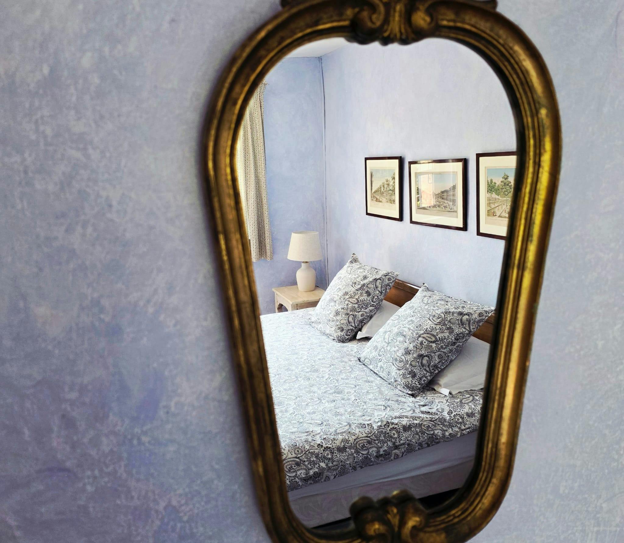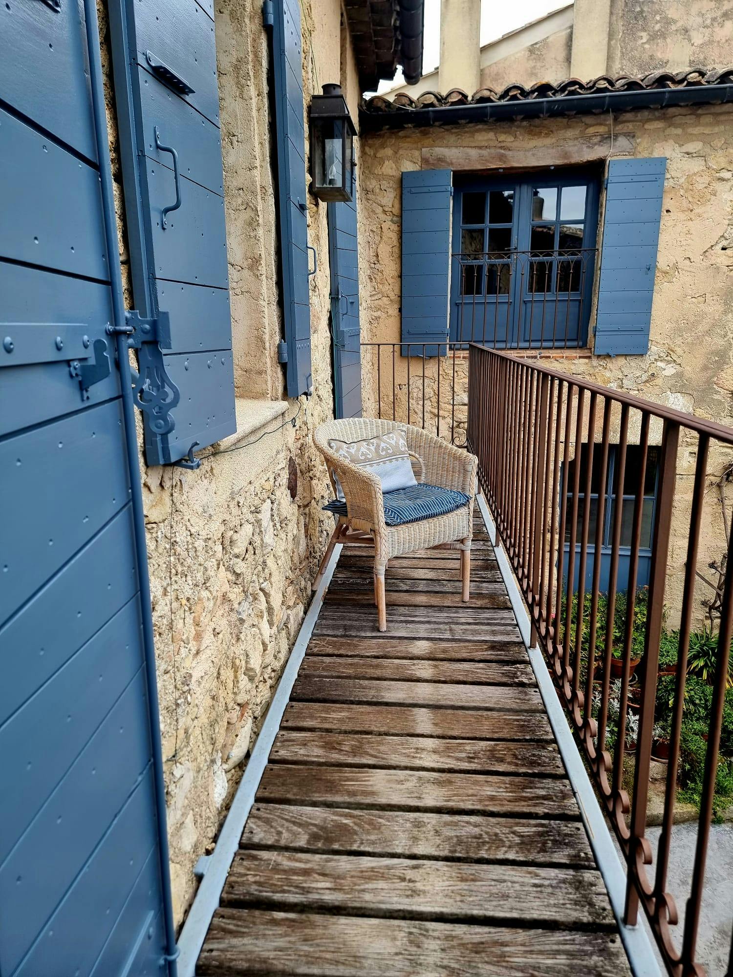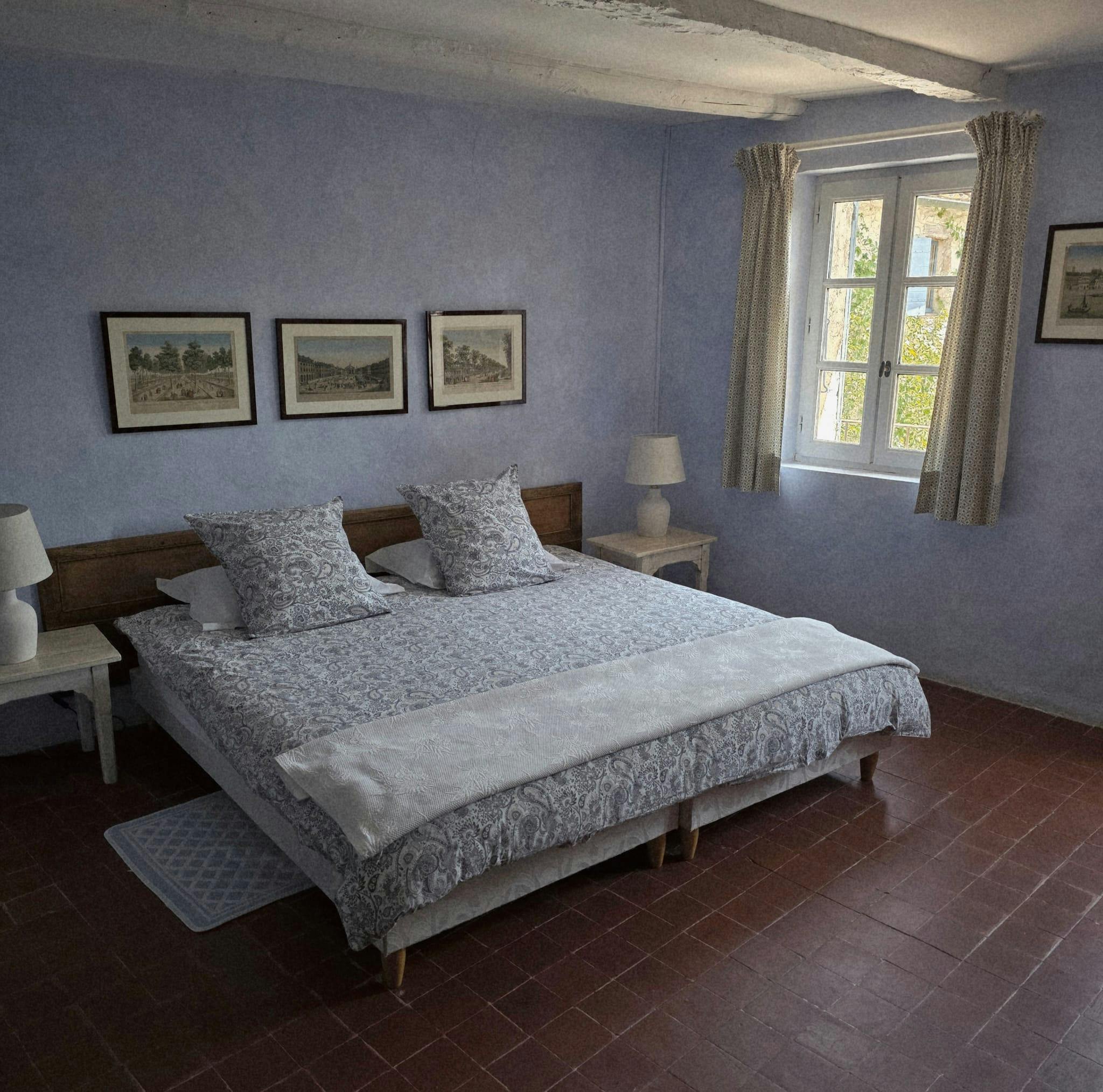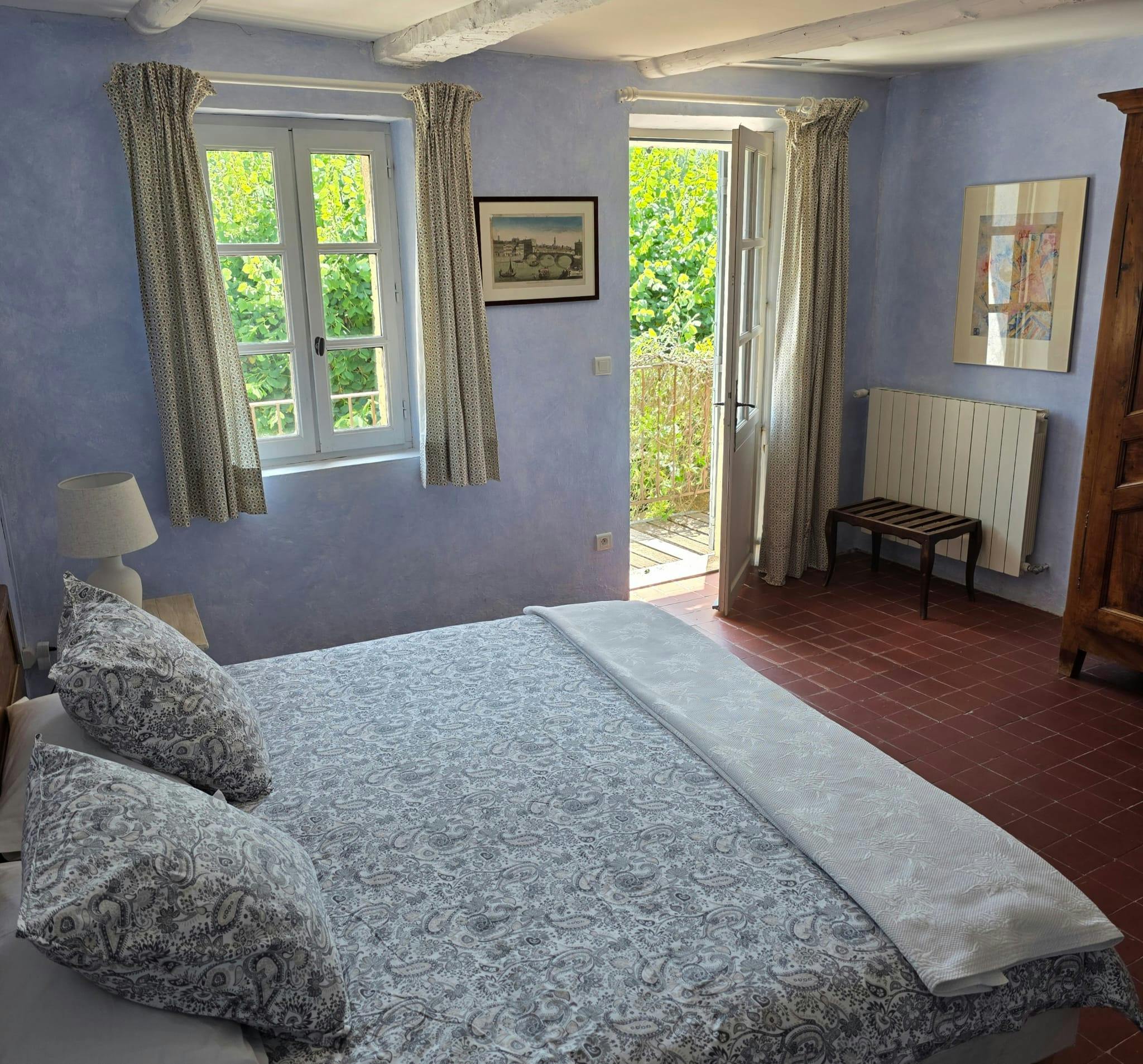 Lavendelkleurige kamer met kingsize bed en eigen badkamer. De kamer heeft een privé-ingang op een klassiek balkon, bereikbaar via een antieke stenen trap bedekt met geurige jasmijn. Uitzicht op de binnenplaats, waar je kunt zitten en ontspannen in de schaduw van de lindebomen, omringd door klassieke kalkstenen muren, bloemen en een fontein die de prachtige binnenplaats omsluiten.