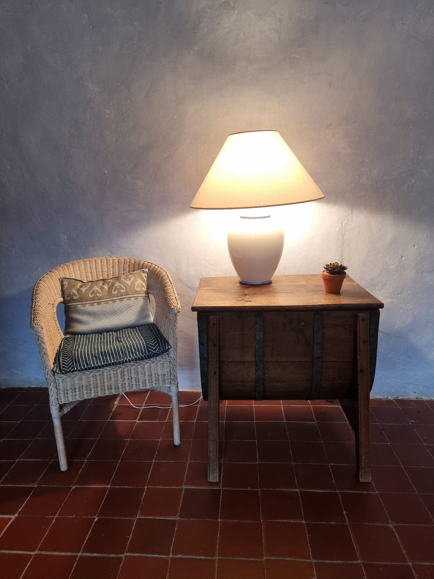 Lavender-colored room with a king-size bed and private bathroom. The room has a private entrance to a classic balcony, accessible via an antique stone staircase covered in fragrant jasmine. It offers views of the courtyard, where you can sit and relax in the shade of the linden trees, surrounded by classic limestone walls, flowers, and a fountain that together enclose the beautiful courtyard.